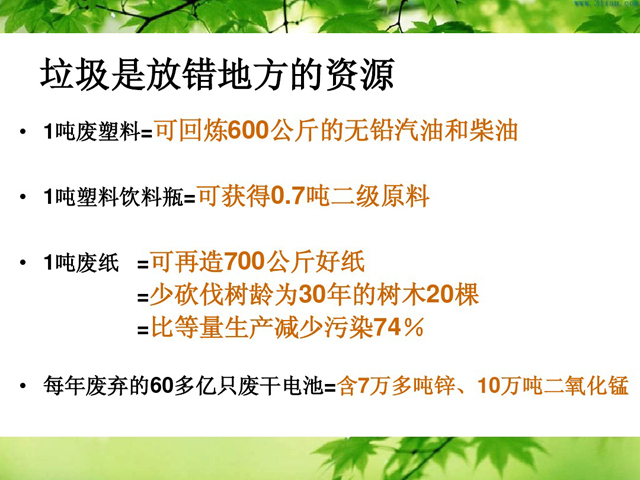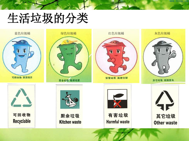 國人每人每年平均產(chǎn)生垃圾300公斤,許多城市都面臨垃圾圍城的局面;生活垃圾被認(rèn)為是最具開發(fā)潛力的、永不枯竭的城市礦藏,是放錯地方的資源;垃圾分類后被送到工廠而不是填埋場,既可以減少耕地,降低垃圾處理成本,又避免了填埋或焚燒所產(chǎn)生的環(huán)境污染,還可以變廢為寶;垃圾分類收集是垃圾資源化利用的前提和基礎(chǔ),是發(fā)展循環(huán)經(jīng)濟的突破口,具有社會、經(jīng)濟、生態(tài)三方面的效益。